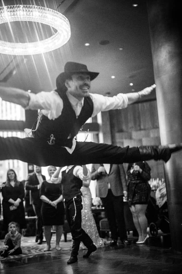 On Sunday, January 22, 2023 four dancers performed during wedding in Teaneck, New Jersey. This Jewish wedding would not be complete without the Hora. After their Bottle Dance routine, dancers invited other guests to join them for the traditional chair dance.