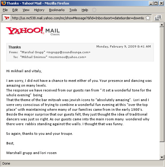 Date: Mon, 15 May 2006 Subject: Re: Dylan's Bar Mitzvah To: Mikhail Smirnov